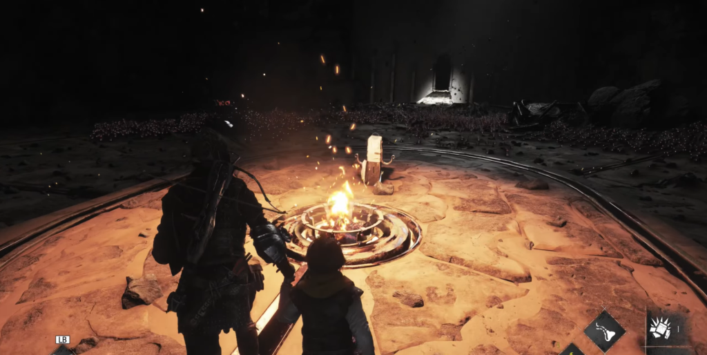 Войдите через это отверстие и подойдите к центральному жаровню. Внезапно появятся крысы, поэтому немедленно зажгите жаровню. Используйте анкерные точки, чтобы притянуть тележки с жаровнями по всей комнате ближе к себе.