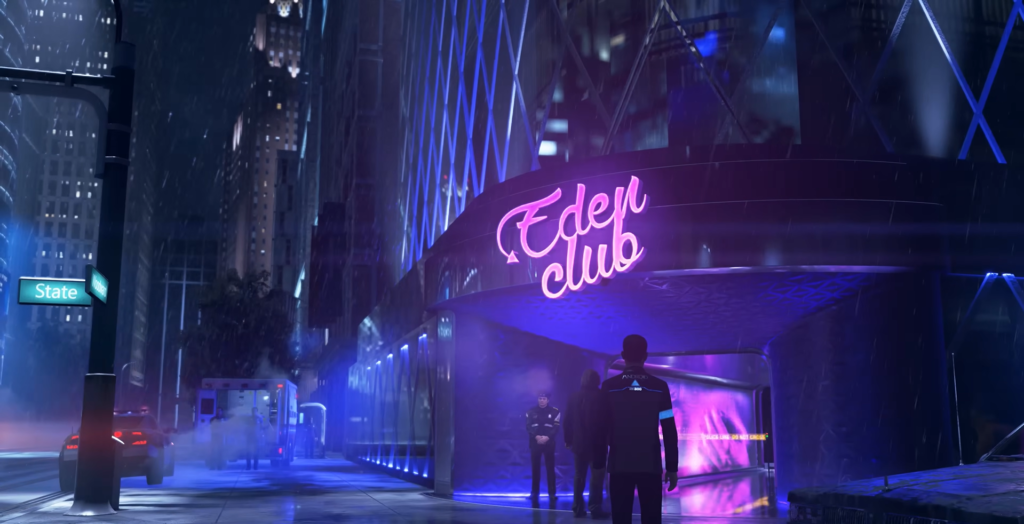 Войдите в ночной клуб Eden вслед за Хэнком. Направляйтесь в глубь заведения — вам предстоит попасть в лаунж-зону. После разговора Хэнка с офицерами переместитесь в помещение, где произошло преступление.