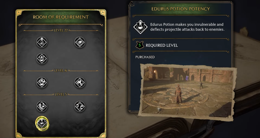Мощность зелья Эдурус (Edurus Potion Potency): Это лучшее защитное улучшение в игре. Зелье не просто снижает урон, оно делает вас полностью неуязвимым на 20 секунд. Более того, оно автоматически отражает любые дистанционные атаки во врагов (даже те заклинания, которые обычно нельзя заблокировать, вроде красных атак или Петрификус Тоталус от магов). Ингредиенты можно найти в мире или купить в лавке Пепина в Хогсмиде.