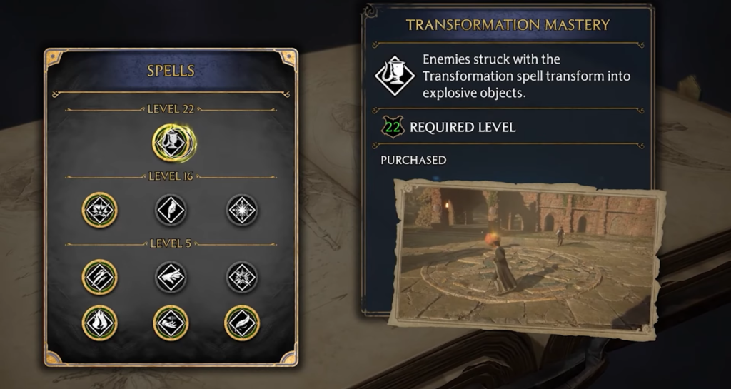(Примечание: Если вы планируете отыгрывать Темного Мага, ветка Темных Искусств с Непростительными заклинаниями также является крайне сильной и позволяет уничтожать целые лагеря одним кастом Авада Кедавры, но это выбор для специфического стиля прохождения).