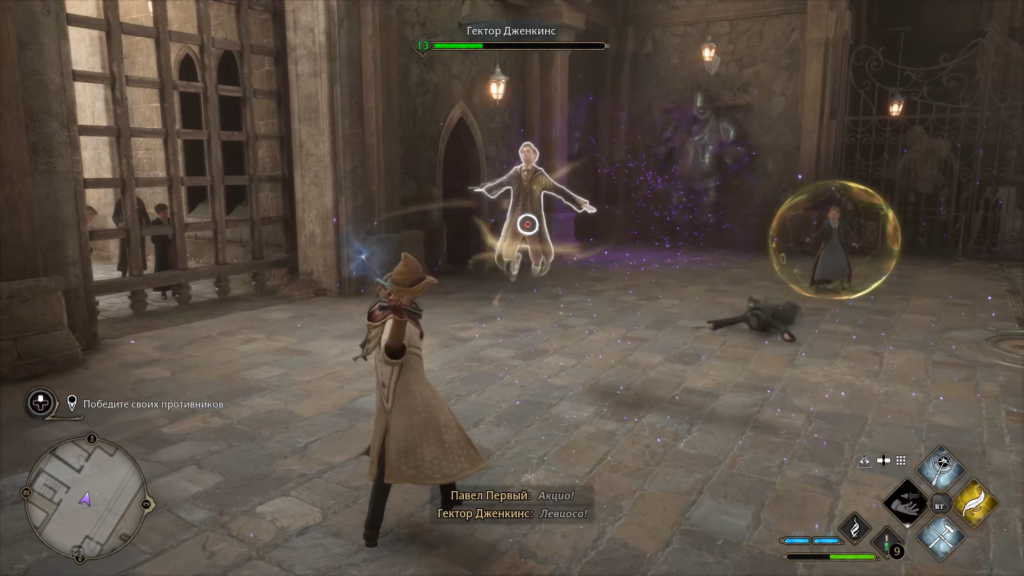 После тренировки примите участие в магических поединках против однокурсников. В первом раунде вам противостоят двое студентов, во втором — уже трое. Используйте изученные заклинания и не забывайте о защитных приёмах.