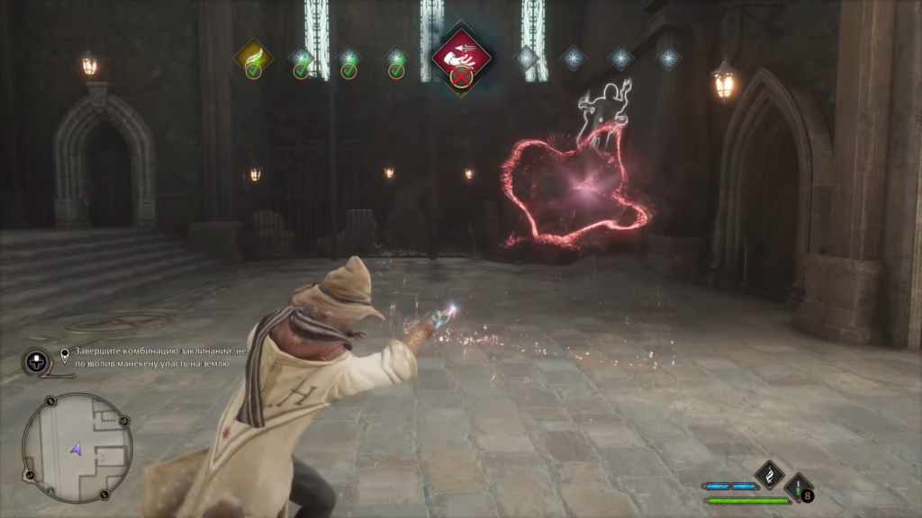 Отправляйтесь к часовой башне и найдите Лукана Браттлби. Суть упражнения проста: выполняйте заклинания согласно подсказкам в верхней части экрана. Главное условие — успеть произнести все заклинания до того, как тренировочный манекен упадёт на землю. Всего предстоит пройти три раунда возрастающей сложности.