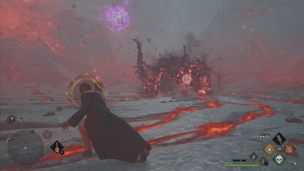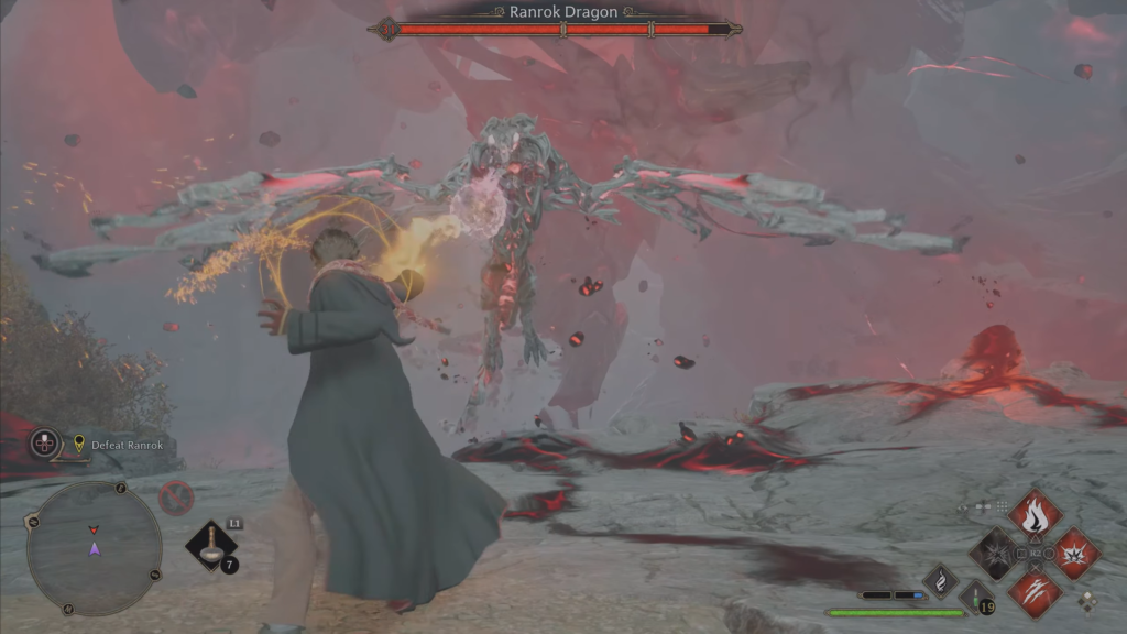 Одна сфера открывает уязвимость Ранрока на короткое время. Атаки дракона стремительны: не всегда понятно, блокировать Протего или уворачиваться. Истощив первый сегмент здоровья, босс разрушит стену — бегите по открывшемуся пути.