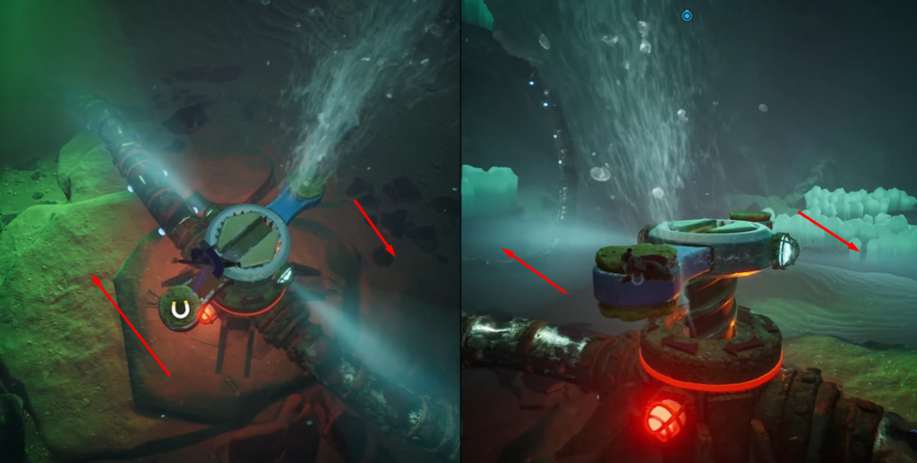 Этот маршрут приведет вас в нижнюю часть, где вы почините три протекающих соединения с помощью большого гаечного ключа. Враждебная рыба патрулирует территорию и будет нападать на вас после каждой починки.