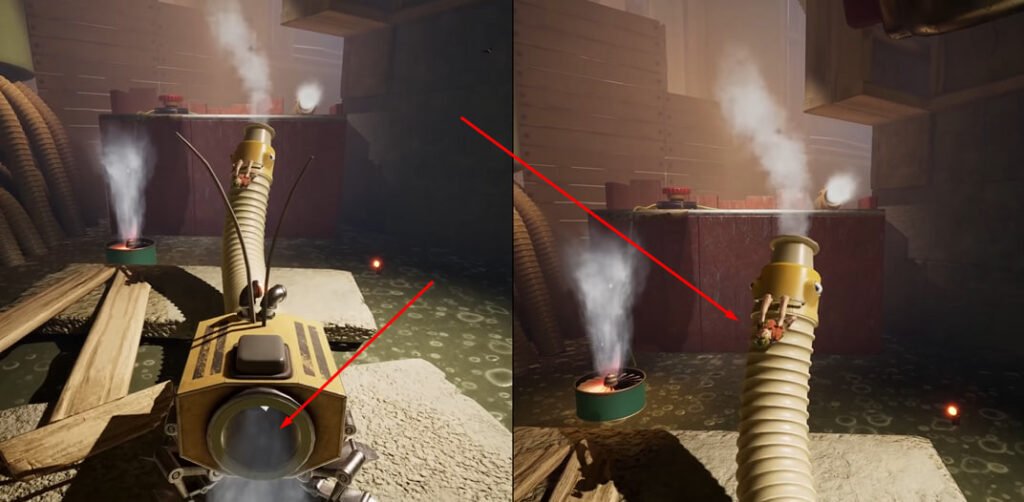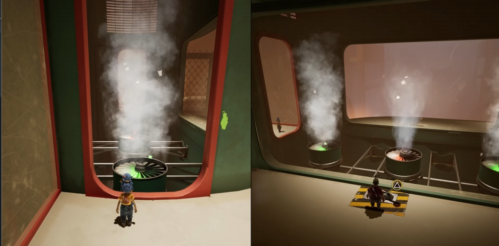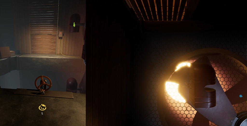 Вскоре вы дойдете до рычага, расположенного рядом с двумя вентиляторами: один из них выдувает воздух, а другой втягивает его. Один игрок остается у рычага и переключает воздушный поток, чтобы другой игрок мог добраться до противоположной стороны.