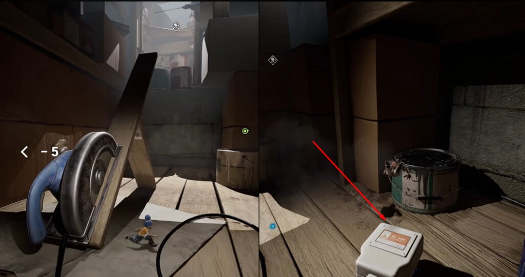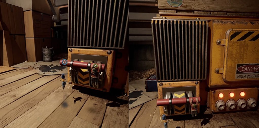 Используйте прыжок с атакой, чтобы разбить розетку перед вами, а затем взаимодействуйте с циркулярной пилой поблизости. Возьмите выпавший предохранитель и отнесите его обратно к генератору.