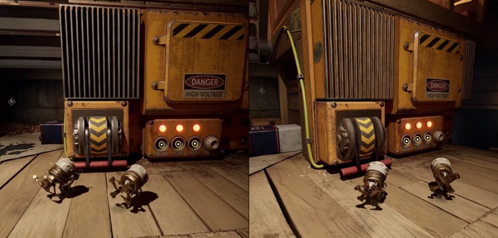 После вступительной заставки направляйтесь прямо к генератору и взаимодействуйте с рычагом. Перегрузка выбивает три предохранителя — два из них падают рядом, а третий отлетает вперед по пути.
