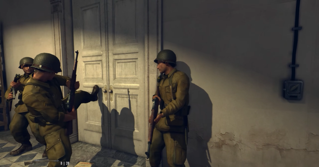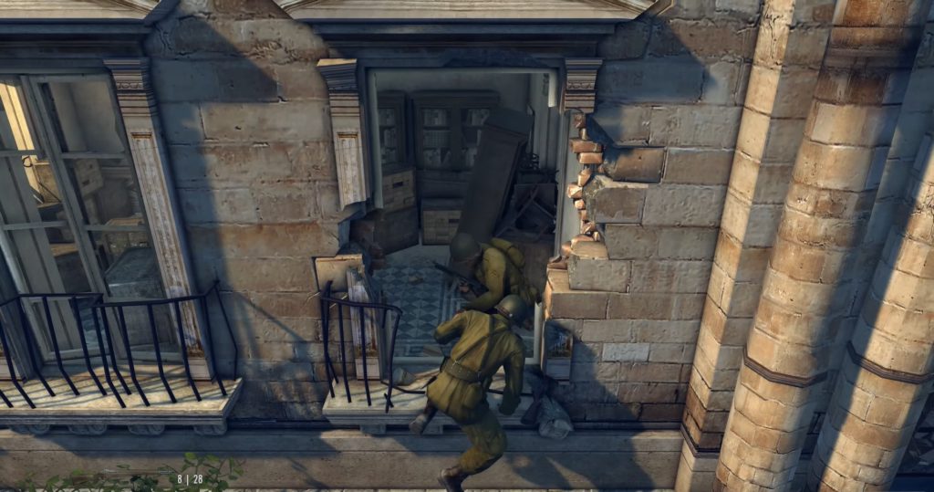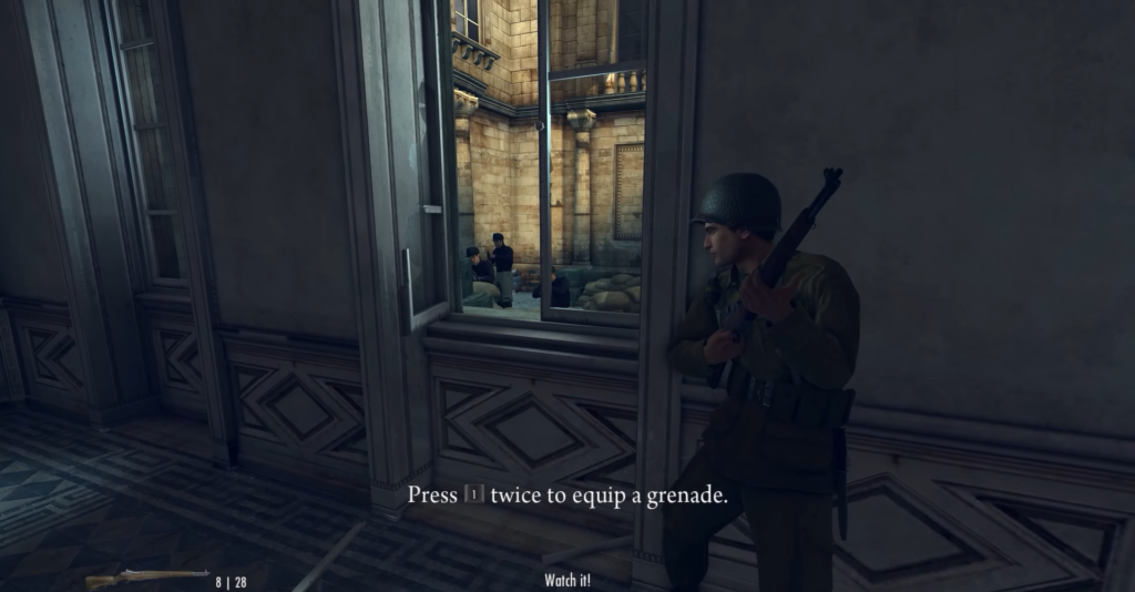 Хотя вы можете свободно исследовать внутренний двор, эффективность диктует необходимость двигаться вперед. Войдите через окно слева от разрушенной двери после того, как ваши товарищи по команде войдут внутрь. Следуйте за ними по коридору, где три фашистских солдата стреляют из внешнего окна. Игра предлагает вам бросить гранату в их сторону. Взрыв вызовет цепную реакцию с хранящимися гранатами и взрывчатыми веществами, нейтрализуя угрозу.