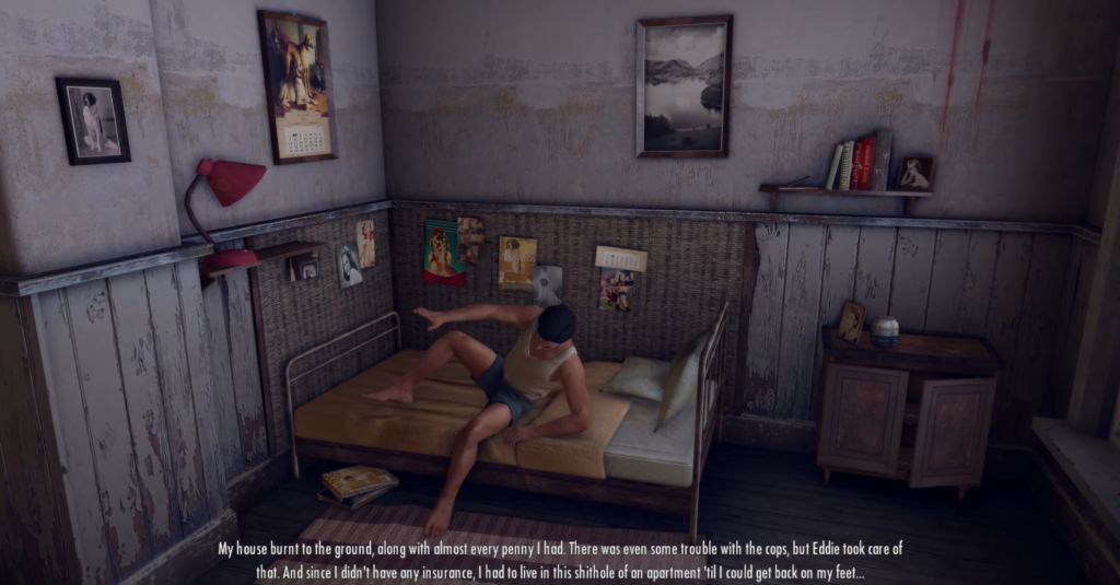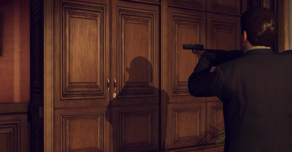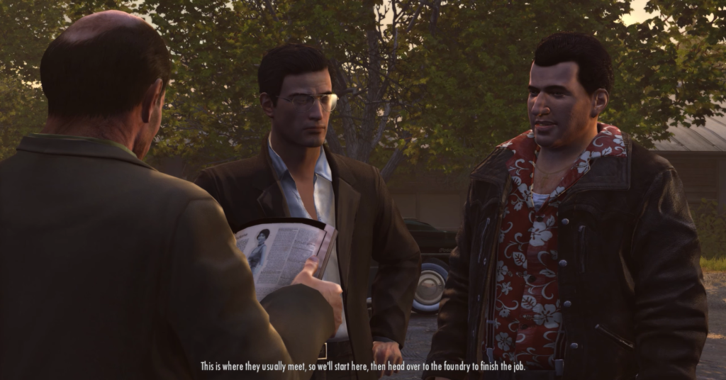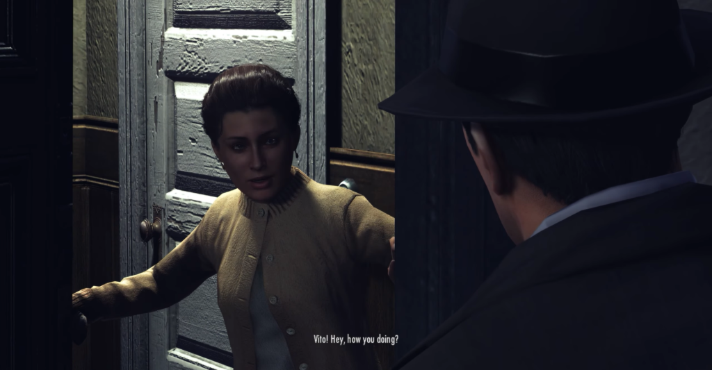Когда будете готовы, отправляйтесь в свою старую спальню и выберите опцию «Спать». На следующее утро вас ждет смена гардероба: вы замените военную форму на гражданскую одежду — кожаную куртку и джинсы, которые определяют уличный стиль Вито на протяжении всей игры.