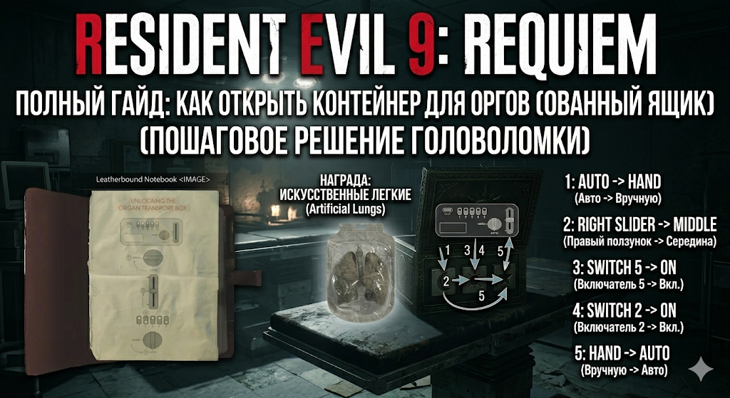 Осмотрите блокнот в инвентаре. Внутри вы найдете документ под названием «Открытие контейнера для органов» (Unlocking the Organ Transport Box). На верхнем изображении в файле четко показана панель управления и правильный порядок взаимодействия с ее элементами.