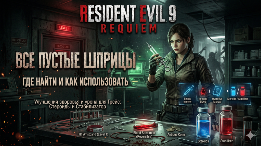 Кровь можно найти по всему Центру опеки (Care Center) и за его пределами. Эта система напоминает классический крафт из прошлых частей серии, но в RE9 кровь выступает скорее в роли валюты. В этом гайде мы подробно разберем один из самых важных предметов для крафта — пустой шприц (Empty Injector). Вы узнаете, для чего он нужен и где найти все шприцы в игре.