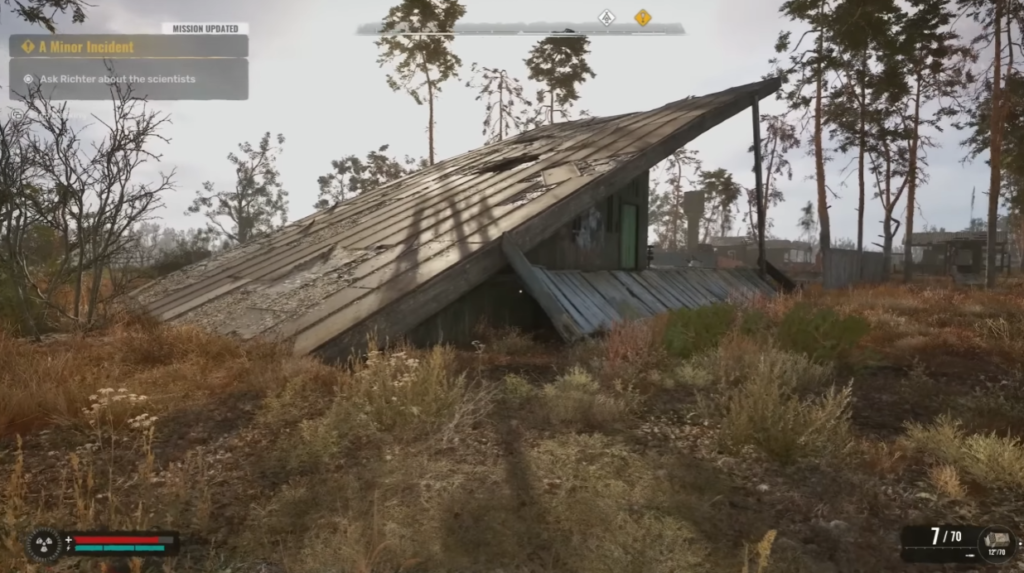 - Связанный квест: «Незваный гость» (The Uninvited Guest). Квест выдает сталкер по имени Мрик Гений (Metric genius), стоящий чуть левее большого здания.