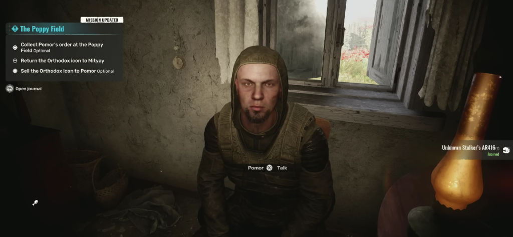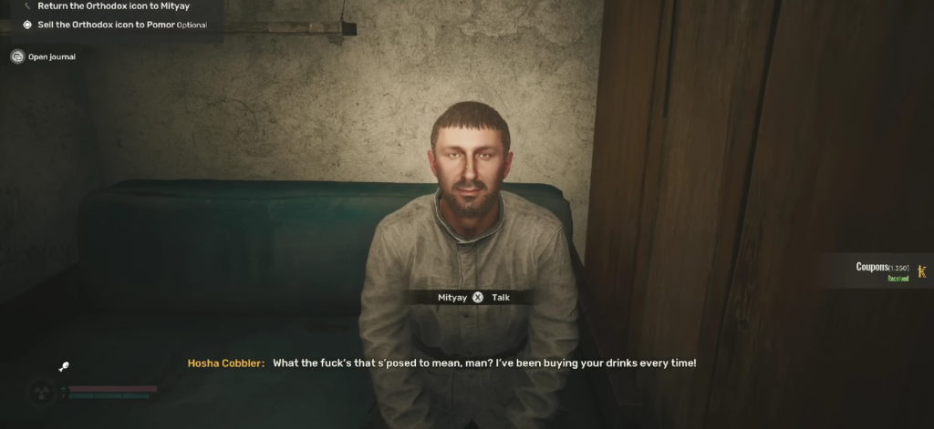 - Поговорите с ним. Он расскажет о потерянной семейной реликвии — религиозной иконе, которая очень для него важна. Скажите ему переходить ближе к делу, чтобы квест появился в вашем ПДА.